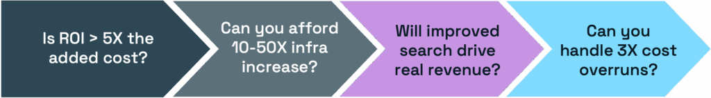 - Can you handle a 10- to 50-fold increase in infrastructure? Costs with embeddings are unpredictable.