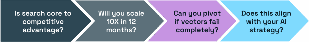 After witnessing numerous teams make costly mistakes, I developed a framework to address these issues. Four pillars that determine whether you actually need vectors. I originally referred to these as the surviving questions. The idea is for you to answer a set of consecutive questions, one followed by the other, and as you go over them until the end, you achieve one of the following goals: either you prove that you are really in need of that technology, or you get a real sense of how unprepared you are to answer the questions. Either way, they help you to evaluate your readiness.