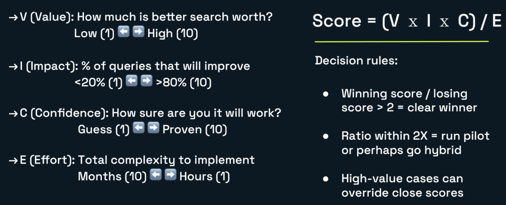 Use the VICE framework. Run the numbers. Make decisions based on data, not hype. Ultimately, your users don’t care whether you’re using vectors or not. They care if the search works.